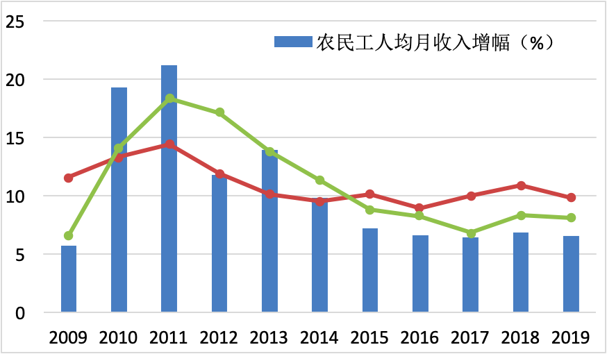 農民工工資在2010年前后曾有過較快的提高,主要得益于各地最低工資的調整。值得注意的是,農民工工資收入相對增速2015年后開始下降。農民工年平均收入2017年是城鎮(zhèn)非私營單位職工平均收入的56%,2019年下降為52.5%。