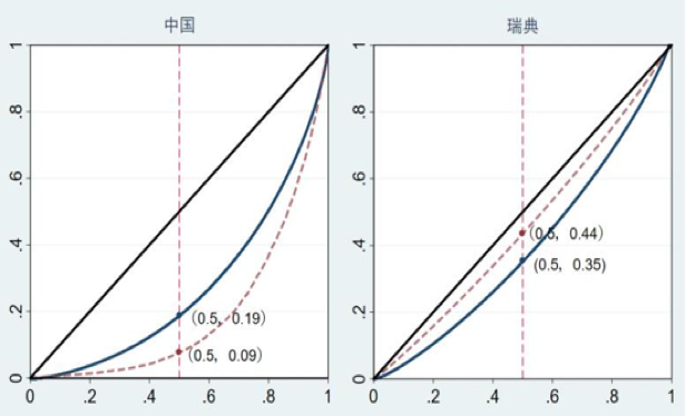 資料來源:中國的曲線根據(jù)CHIPS2018年調查數(shù)據(jù)計算繪制。瑞典的曲線根據(jù)Nieuwenhuis,Nelson和Alm在2020年發(fā)表論文中2003年的基尼系數(shù)與集中度的數(shù)據(jù)模擬繪制。